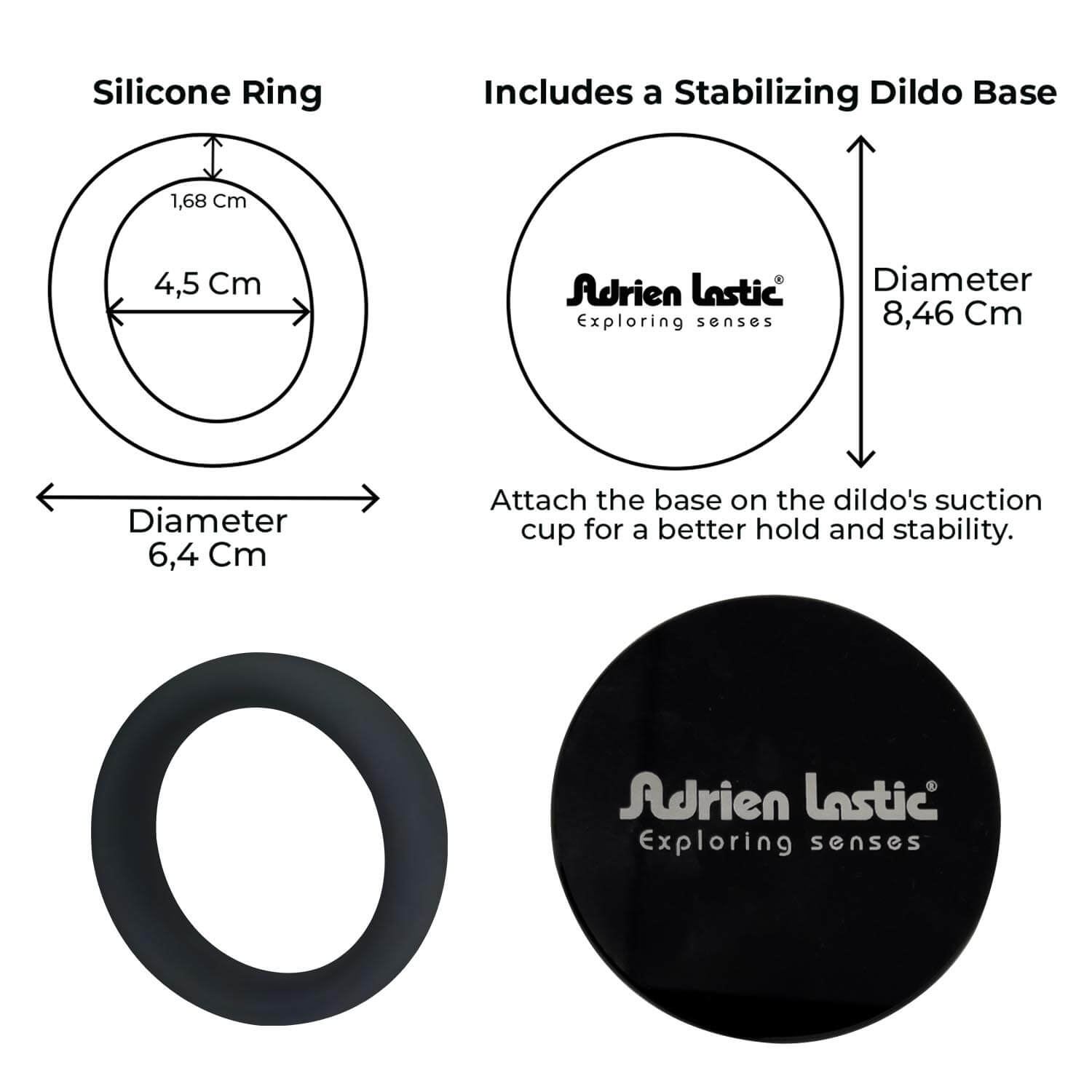 The dildo is fixed to the ring with the anchor and can be adjusted to any type of dildo as long as it has a suitable base and its diameter does not exceed 4.5 centimeters (1.75 inches)